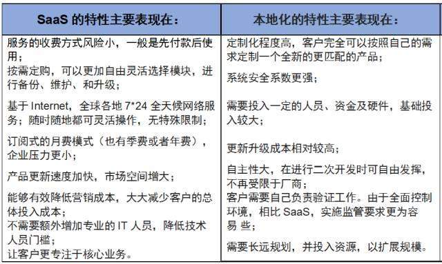 我们先来看一下SaaS和本地部署的特性比较: